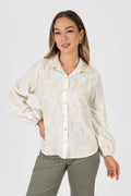 Destaca por sus mangas abullonadas que aportan volumen y feminidad, y por su tela con bordado sutil que la hace única, elegante y fuera de lo común.