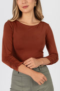El Polo Zoe es un básico elevado que combina comodidad y elegancia en una sola prenda. Su diseño de manga 3/4 incorpora un delicado detalle de recogido en las mangas, aportando un toque sofisticado y diferente a un clásico imprescindible.